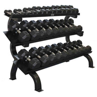 The VTX by Troy commercial-grade, 3-Tier Horizontal Shelf Rack holds a 5 lb to 75 lb dumbbell set of solid dumbbells (15 pairs) with ease but is also compact enough for those with limited floor space. Additionally, the heavy-duty, powder-coated shelves are angled for easy storage and removal, so you can keep focused on your workout.